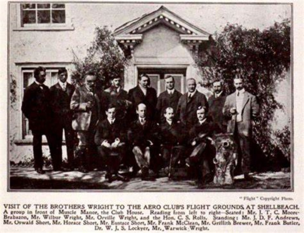 The same week (May 1909) the Wright brothers visited the Aero Club flying ground. After inspecting the Short Brothers’ factory, a photograph was taken outside Mussell Manor of the Wright Brothers with all of the early British aviation pioneers to commemorate their visit to Britain.