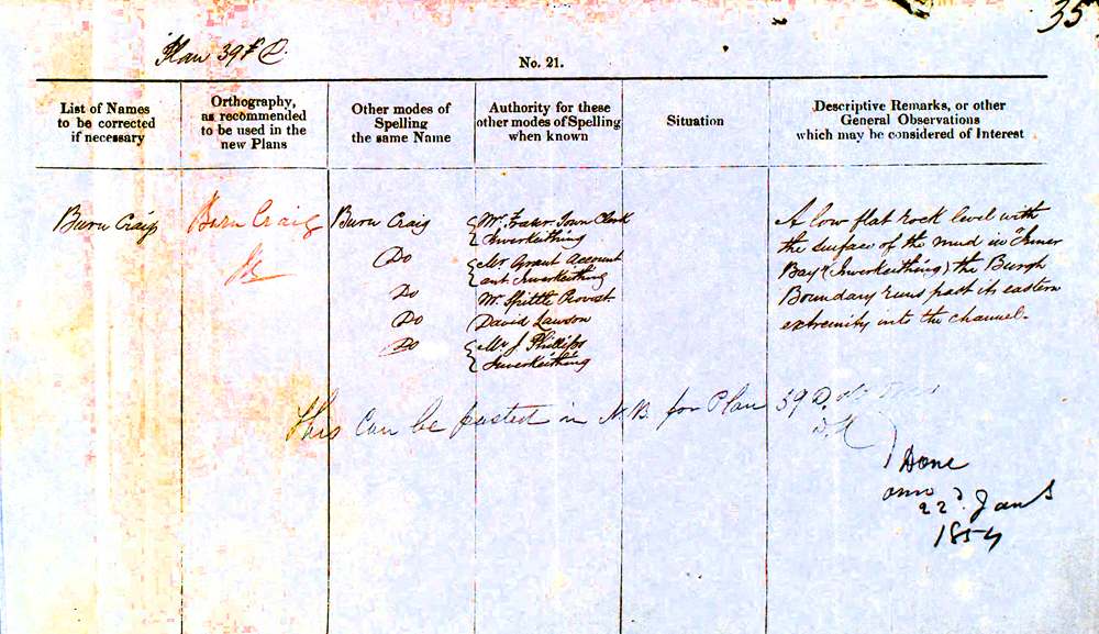 BURN CRAIG Burn Craig Burn Craig Mr Fraser, Town Clerk, Inverkeithing   A low rock level with the surface of the mud in “Inner Bay” (Inverkeithing) the Burgh Boundary runs past its eastern extremity into the channel